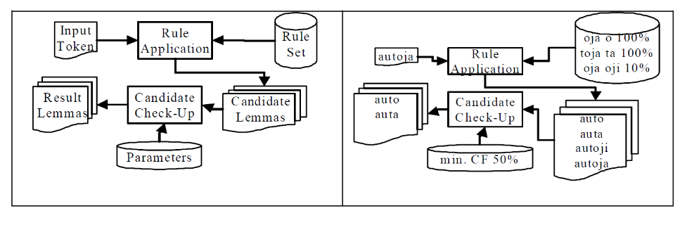 StaLe-Algorithmus, der eine Menge von Regeln anwendet, um Wörter zu transformieren und die erstellten Kandidaten anschließend zu filtern: