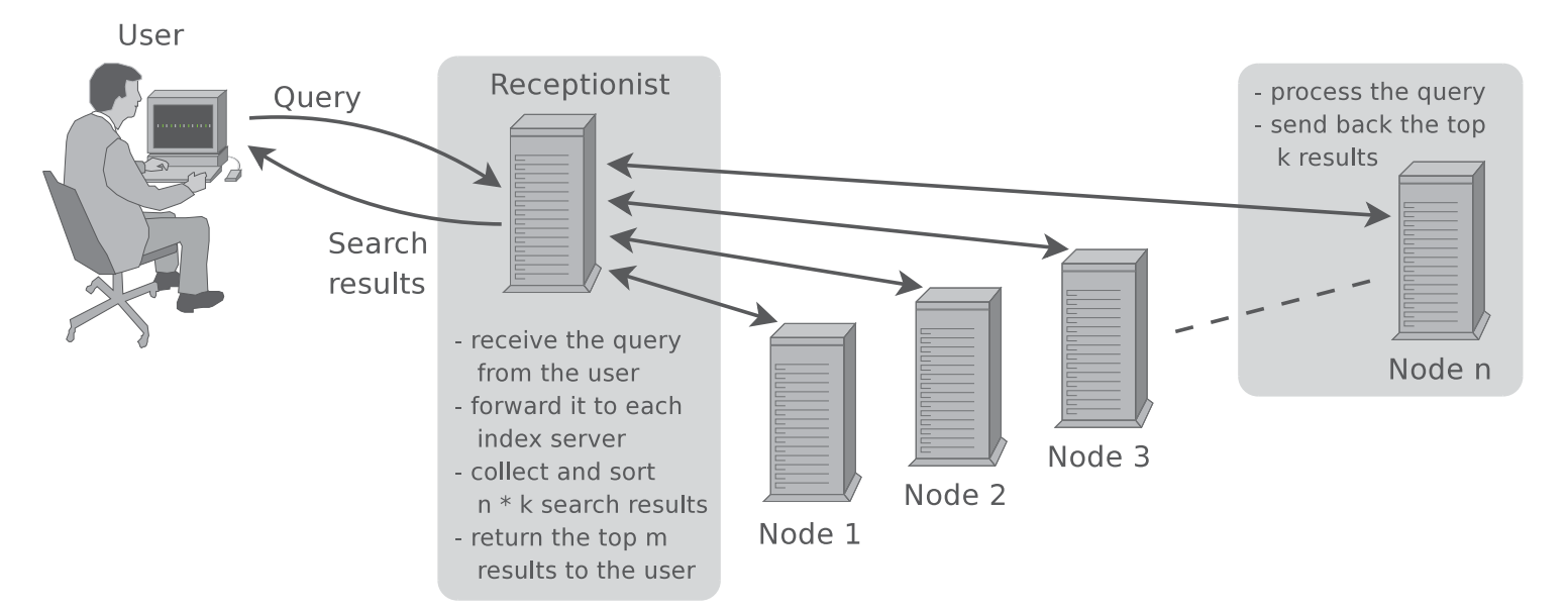 Vorteil dieses Ansatzes ist, dass die Suche parallelisiert durchgeführt werden kann und dass auch bei einem Ausfall einiger Knoten weiter eine Ergebnismenge erstellt werden kann.