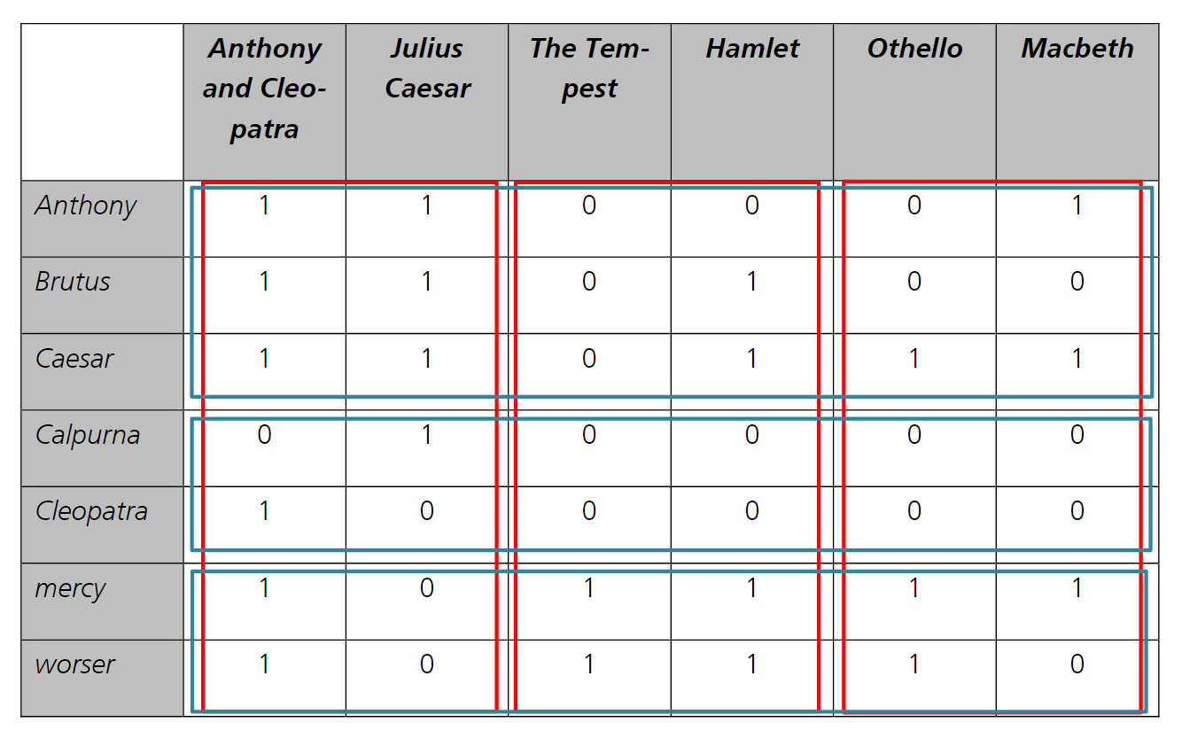 Das folgende Beispiel zeigt jeweils eine Partitionierung nach Dokumenten (rote Rahmen) und nach Termen (blaue Rahmen):