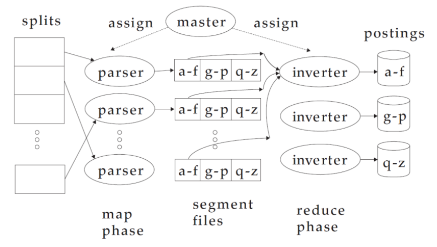 Partitionen verteilt, wobei jede Partition für einen bestimmten Term- bzw. Buchstabenbereich zuständig ist (z. B. a-f,g-p,q-z).In der Reduce-Phase werden sogenannte Inverter eingesetzt. Jeder Inverter sammelt alle