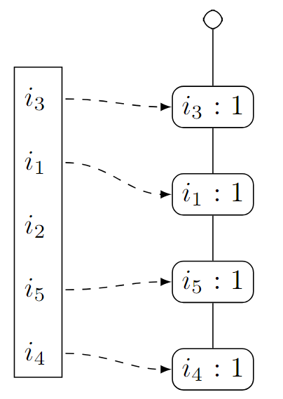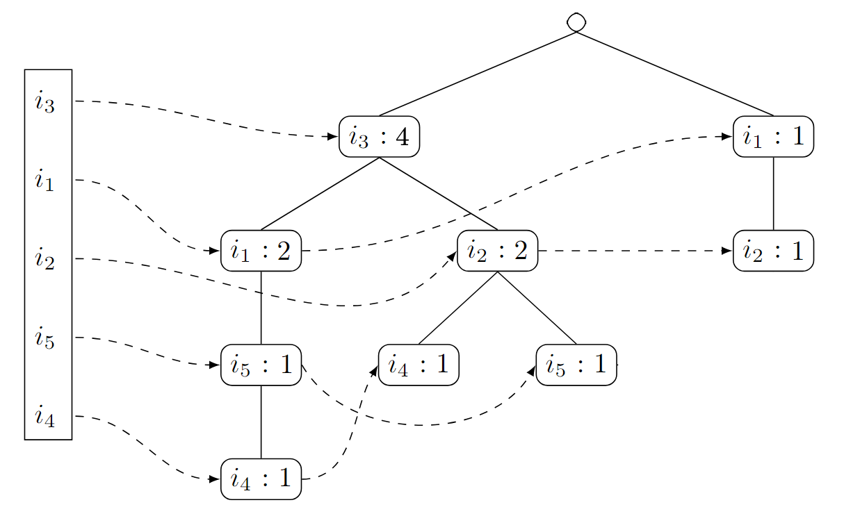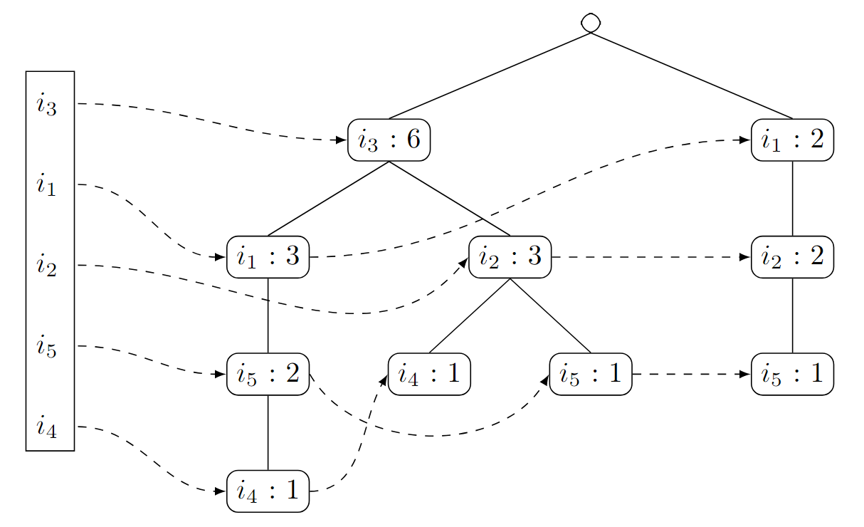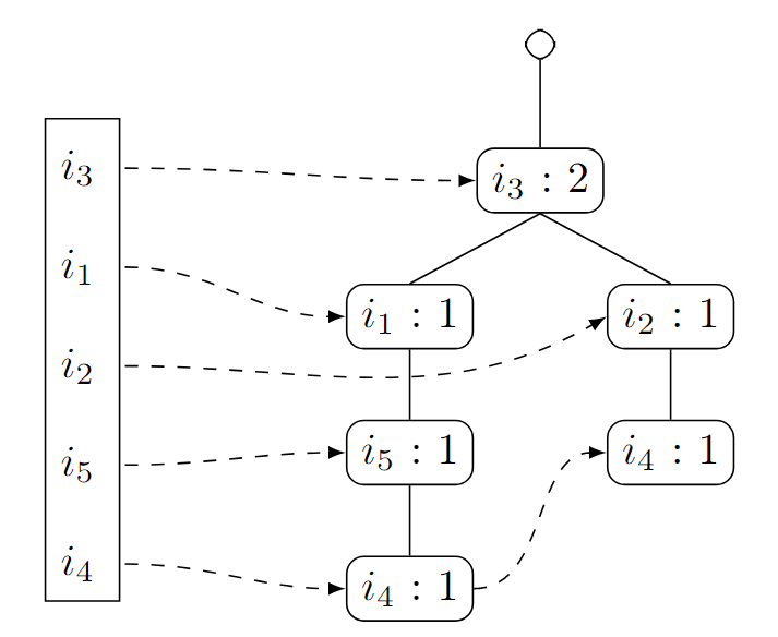 Um den FPTree-Algorithmus im weiteren Verlauf auch für den FPGrowth-Algorithmus nutzen zu können, müssen wir uns neben dem Baum selbst auch noch merken, in welcher Reihenfolge die Knoten angelegt wurden.